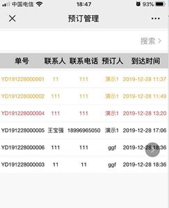 手机、平板收银端点击更多à预定管理进入后即可默认看到当天已预定但还未到店的有效订单,点击搜索还可按预定时间、到达时间、未到店、已到店、已取消、有押金、无押金等方式查询你想要的相应订单数据,另根据订单类型不同订单颜色也不同,未到店有效订单:黑色,已到店订单:黄色,已取消订单:红色,